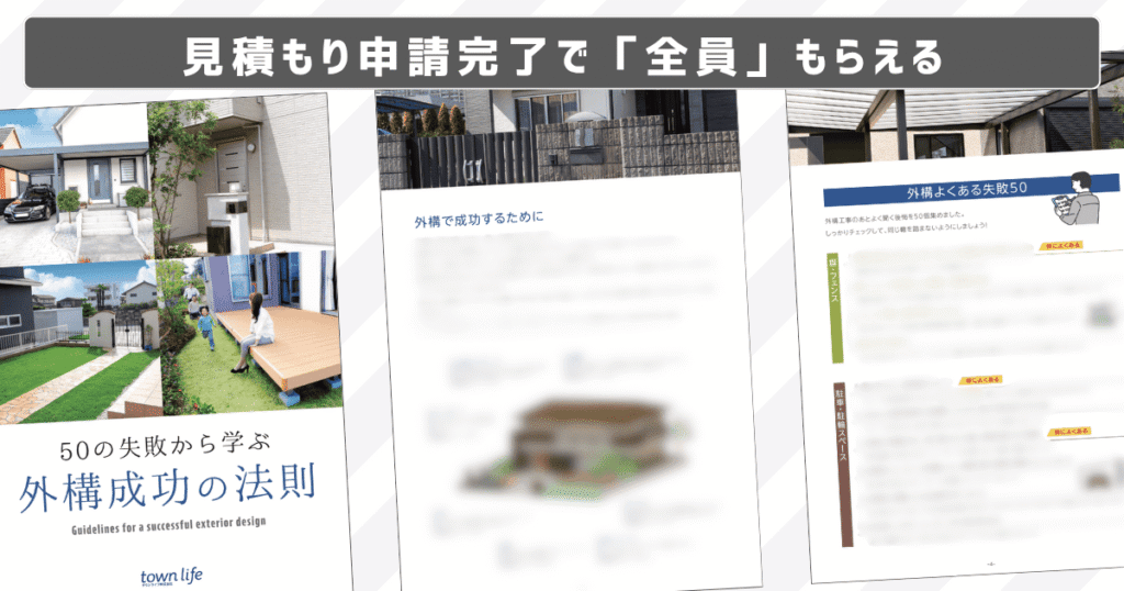 ちなみに今回の記事で紹介した外構サービスで、外構プランを取り寄せるだけで「外構の失敗50選」が学べる豪華特典がついてきます。