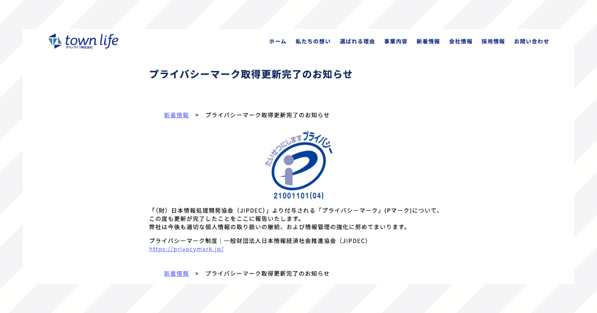 また、タウンライフはプライバシーマーク(個人情報を適切に管理していると評価された事業者がだけ使用できるマーク)を取得しており、第三者機関から評価されている点も安心の一つです。