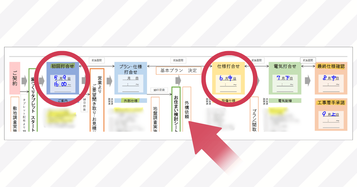 打ち合わせ1週間後にられてきた図面を確認し、それに対して修正案や質問をMYポストに投函(&営業担当にその旨を伝える)まで実施しておきましょう。