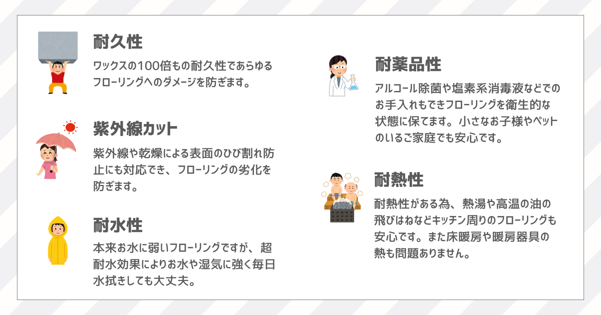 近年多くのご家庭で使用されているシートフローリングへの適正を高めると共により機能性を向上させたコーティングです。