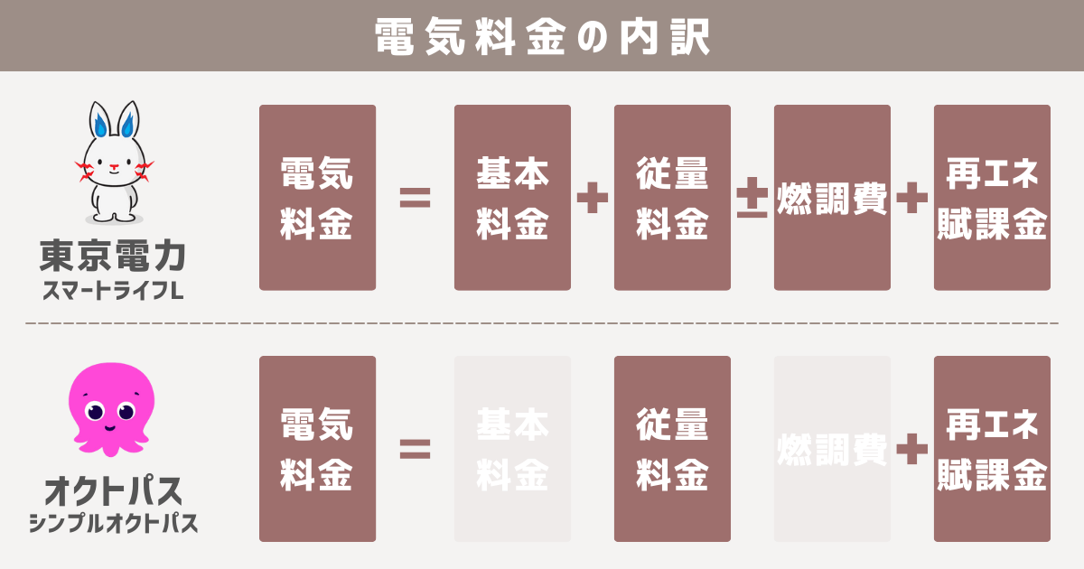 「シンプルオクトパス」が魅力的なのは、基本料が0円だけでなく、燃調費も0円というところ。東京電力のプランと比較してみると一目瞭然です。